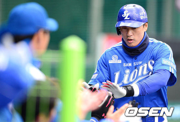 2회초 무사에서 삼성 이승엽이 동점 솔로포를 날리고 더그아웃에서 동료선수들과 하이파이브를 하고 있다.