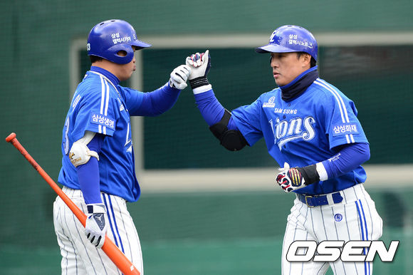 2회초 무사에서 삼성 이승엽이 동점 솔로포를 날리고 홈을 밟으며 박한이와 하이파이브를 하고 있다.