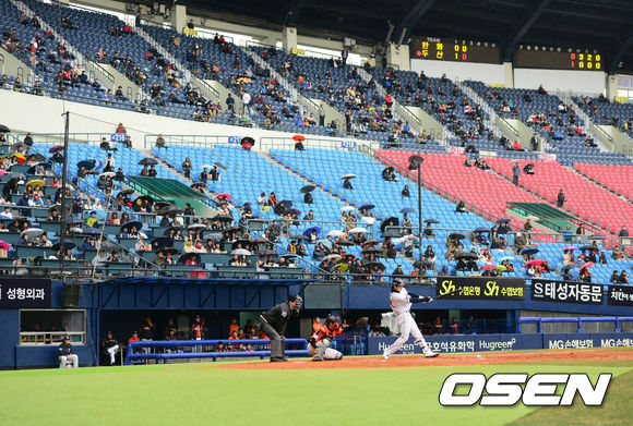 20일 오후 서울 잠실구장에서 열린 '2014 프로야구 시범경기' 두산 베어스와 한화 이글스의 경기 2회말 봄비가 내리는 가운데, 관중들이 우산을 쓰고 경기를 지켜보고 있다.