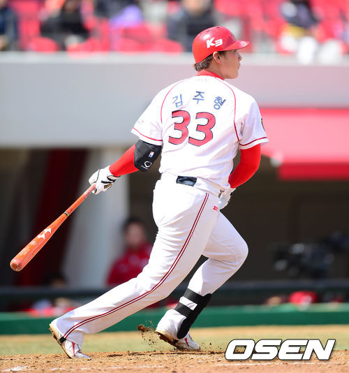 3회말 2사에서 KIA 김주형이 좌중간을 가르는 안타를 치고 있다.