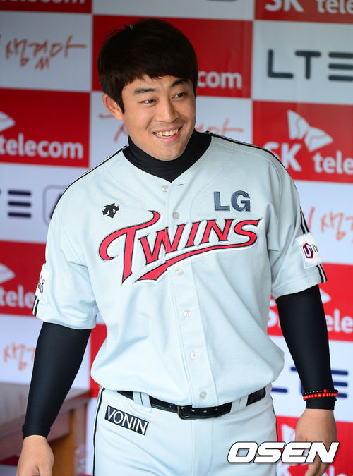 20일 오후 인천 문학구장에서 '2014 프로야구' 시범경기 SK 와이번스와 LG 트윈스의 경기가 열렸다. 경기 전 LG 정의윤이 미소짓고 있다.