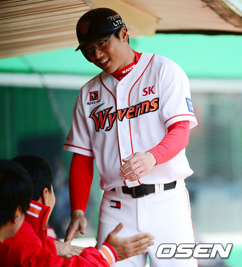 20일 오후 인천 문학구장에서 '2014 프로야구' 시범경기 SK 와이번스와 LG 트윈스의 경기가 열렸다. 4회말 1사 주자 1,2루 SK 조인성이 중견수 앞 1타점 적시타때 홈을 밟은 박정권이 덕아웃에서 동료들과 기쁨을 나누고 있다.