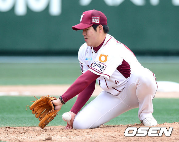 8회초 무사에서 넥센 한현희가 삼성 정형식의 투수앞 땅볼 타구에 무릎부위를 맞고 있다.