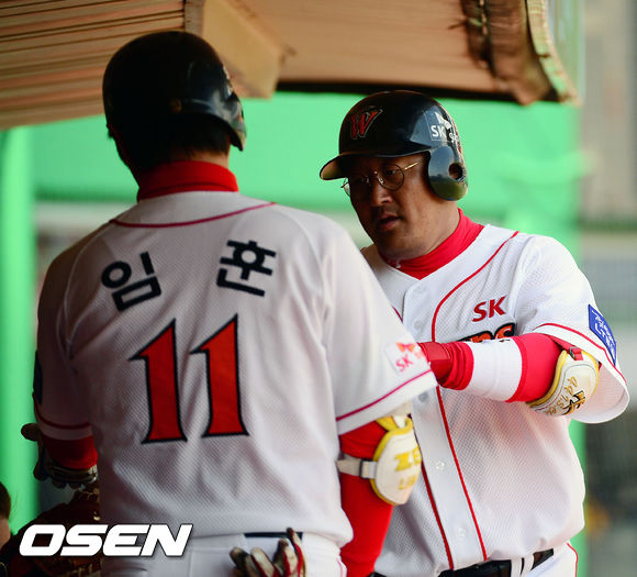 20일 오후 인천 문학구장에서 '2014 프로야구' 시범경기 SK 와이번스와 LG 트윈스의 경기가 열렸다. 7회말 선두타자 SK 조인성이 솔로 홈런을 날린 후 덕아웃에서 동료들과 기쁨을 나누고 있다.