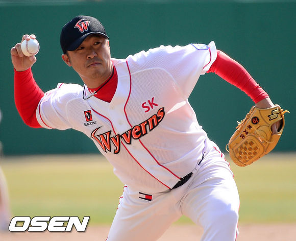 20일 오후 인천 문학구장에서 '2014 프로야구' 시범경기 SK 와이번스와 LG 트윈스의 경기가 열렸다. 7회초 SK 임경완이 힘차게 공을 뿌리고 있다.