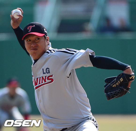 20일 오후 인천 문학구장에서 '2014 프로야구' 시범경기 SK 와이번스와 LG 트윈스의 경기가 열렸다. 6회말 LG 신승현이 힘차게 공을 뿌리고 있다.