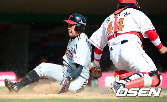 20일 오후 인천 문학구장에서 '2014 프로야구' 시범경기 SK 와이번스와 LG 트윈스의 경기가 열렸다. 8회초 2사 주자 1루 LG 벨의 우익수 앞 1타점 적시타때 1루 주자 백창수가 홈으로 몸을 날리고 있다.