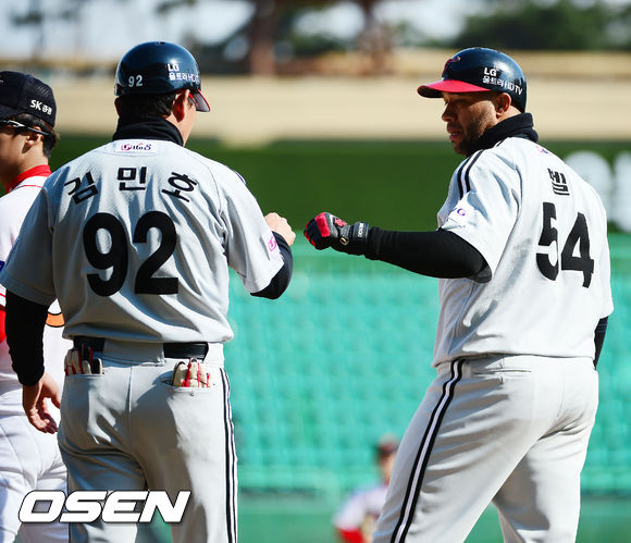 20일 오후 인천 문학구장에서 '2014 프로야구' 시범경기 SK 와이번스와 LG 트윈스의 경기가 열렸다. 8회초 2사 주자 1루 LG 벨이 우익수 앞 동점 1타점 적시타를 날린 후 김민호 코치와 하이파이브를 하고 있다.