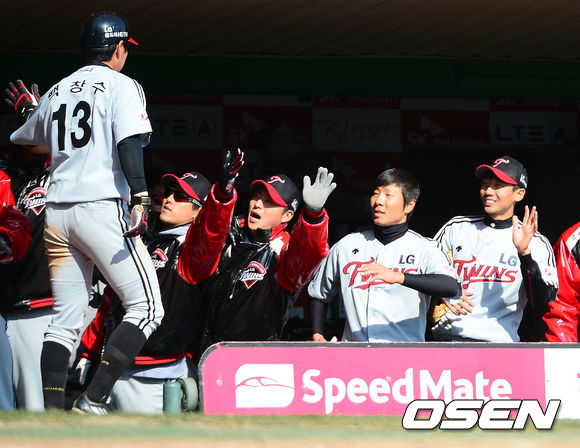 20일 오후 인천 문학구장에서 '2014 프로야구' 시범경기 SK 와이번스와 LG 트윈스의 경기가 열렸다. 8회초 2사 주자 1루 LG 벨의 우익수 앞 1타점 적시타때 1루 주자 백창수가 홈에서 세이프 된 후 덕아웃에서 동료들과 하이파이브를 하고 있다.