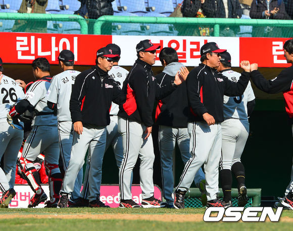 경기를 마치고 LG 김기태 감독이 선수들과 하이파이브를 하고 있다./ rumi@osen.co.kr