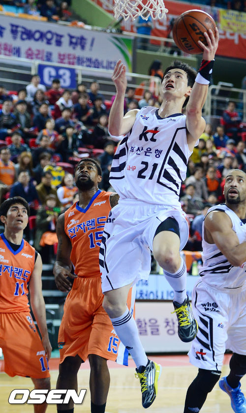 20일 오후 인천 부평구 삼산월드체육관 열린 '2013-2014 KB국민카드 프로농구' 6강 플레이오프 5차전 인천 전자랜드와 부산 KT의 경기 1쿼터 KT 오용준이 공격에 성공하고 있다.