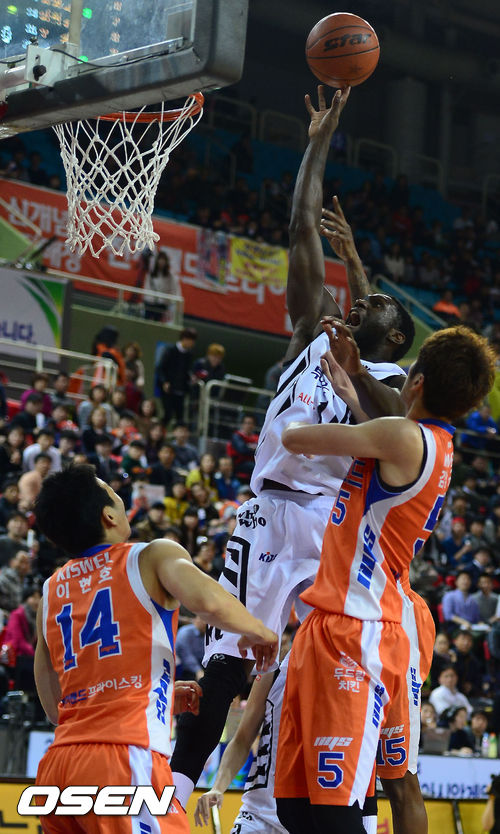 20일 오후 인천 부평구 삼산월드체육관 열린 '2013-2014 KB국민카드 프로농구' 6강 플레이오프 5차전 인천 전자랜드와 부산 KT의 경기, 2쿼터 KT 파틸로가 팁인에 성공하고 있다.