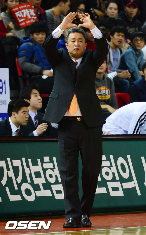 20일 오후 인천 부평구 삼산월드체육관 열린 '2013-2014 KB국민카드 프로농구' 6강 플레이오프 5차전 인천 전자랜드와 부산 KT의 경기, 2쿼터 KT 전창진 감독이 사인을 보내고 있다.