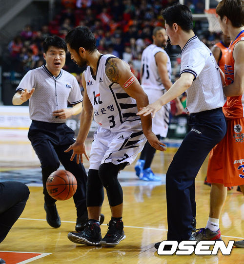 20일 오후 인천 부평구 삼산월드체육관 열린 '2013-2014 KB국민카드 프로농구' 6강 플레이오프 5차전 인천 전자랜드와 부산 KT의 경기, 3쿼터 파울을 범한 KT 전태풍이 볼을 주지 않자 심판이 말리고 있다.