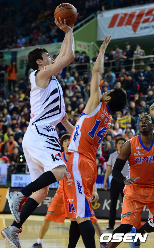 20일 오후 인천 부평구 삼산월드체육관 열린 '2013-2014 KB국민카드 프로농구' 6강 플레이오프 5차전 인천 전자랜드와 부산 KT의 경기, 3쿼터 KT 송영진이 전자랜드 이현호의 블로킹을 피해 점프슛을 날리고 있다.