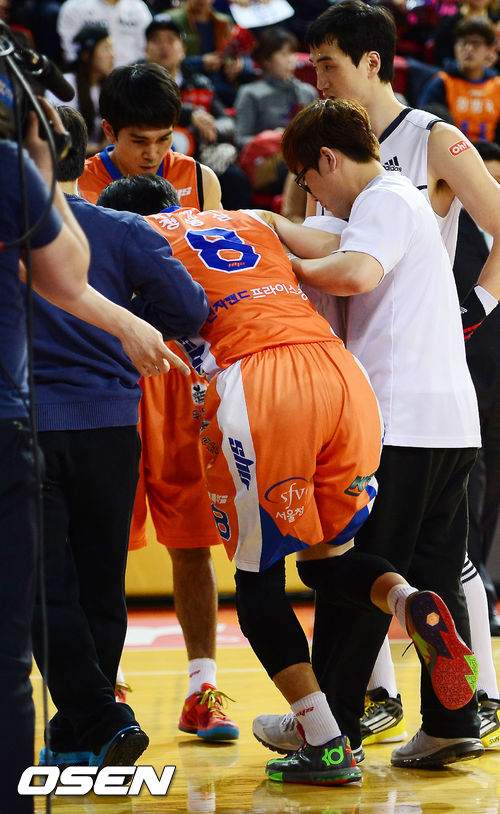 1쿼터 전자랜드 정영삼이 부상으로 교체되고 있다. / rumi@osen.co.kr