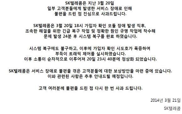 SKT는 이 사과문에서 "지난 20일 일부 고객분들에게 발생한 서비스 장애로 인해 불편을 드린 점 진심으로 사과드린다"며 "3월 20일 18시 가입자 확인 모듈 장애 발생 직후, 조속한 해결을 위한 긴급 복구 작업 및 정확한 원인 규명 작업에 착수해 문제 발생 24분 후 시스템 복구를 완료 했다"고 밝혔다.