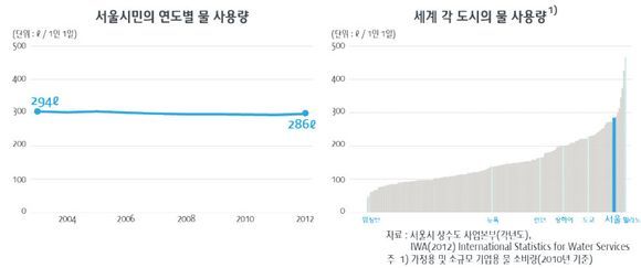 서울 시민의 물 사용량은 지난 10년간 매년 줄었지만 미국 뉴욕, 영국 런던, 중국 상하이, 일본 도쿄 등 세계 주요 도시 시민에 비해 많은 수준이다. 도쿄 시민 1명의 하루 물 사용량은 200∼250ℓ, 뉴욕·런던·상하이는 100∼200ℓ 정도다.