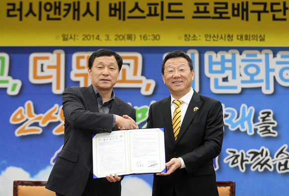 프로배구 러시앤캐시 베스피드가 20일 안산시청 대회의실에서 연고 협약식을 개최하고 안산시를 연고지로 확정했다.