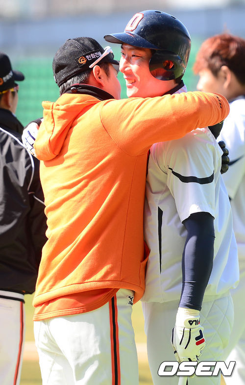 21일 오후 서울 잠실구장에서 열리는 '2014 프로야구 시범경기' 두산 베어스와 한화 이글스의 경기 시작전 이대수와 고영민이 포옹을 나누고 있다.