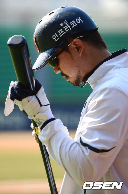 21일 오후 서울 잠실구장에서 열리는 '2014 프로야구 시범경기' 두산 베어스와 한화 이글스의 경기 시작전 오재원이 자신의 방망이를 손질하고 있다.