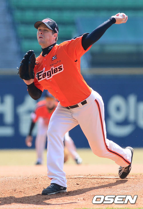 21일 오후 서울 잠실구장에서 열린 '2014 프로야구 시범경기' 두산 베어스와 한화 이글스의 경기 한화 선발 앨버스가 역투하고 있다.