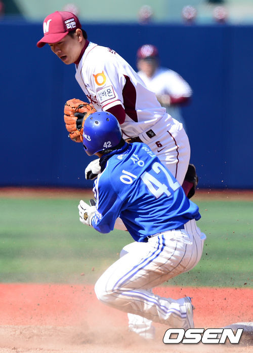 2회초 1사 1루에서 넥센 백승룡이 삼성 백상원의 1루 땅볼에 이상훈을 포스아웃시키고 1루 송구 동작도중 이상훈과 충돌하고 있다.