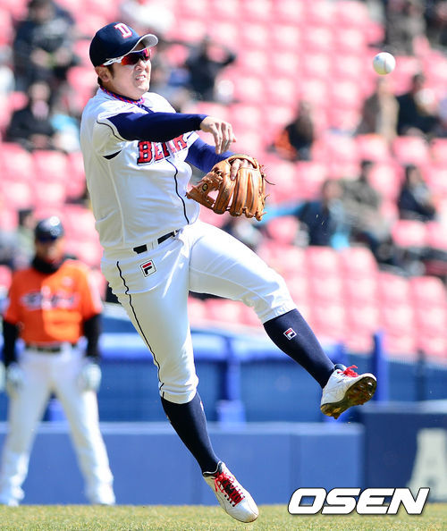 21일 오후 서울 잠실구장에서 열린 '2014 프로야구 시범경기' 두산 베어스와 한화 이글스의 경기 3회초 1사 추승우의 번트를 최주환이 잡아 1루로 송구 아웃 시키고 있다.
