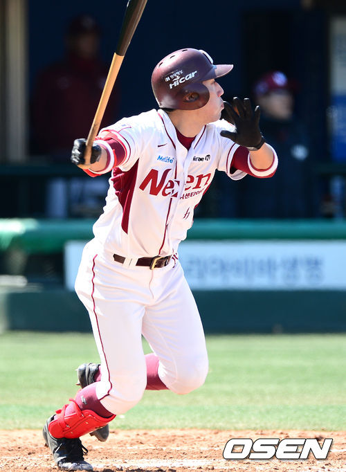 2회말 2사 1,2루에서 넥센 서건창이 2타점 적시 2루타를 날리고 타구를 바라보고 있다.
