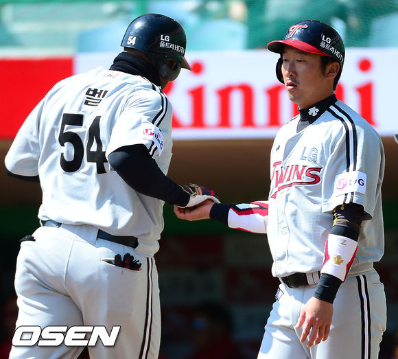 21일 오후 인천 문학구장에서 '2014 프로야구' 시범경기 SK 와이번스와 LG 트윈스의 경기가 열렸다. 1회초 2사 만루에서 LG 정의윤의 우익수 오른쪽 2타점 적시타때 홈을 밟은 벨과 이병규가 하이파이브를 하고 있다.