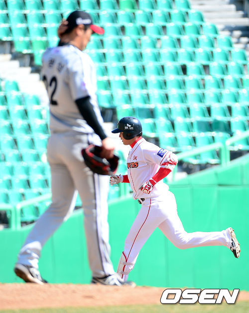 21일 오후 인천 문학구장에서 '2014 프로야구' 시범경기 SK 와이번스와 LG 트윈스의 경기가 열렸다. 3회말 2사 주자 1루 SK 최정이 좌월 동점 투런 홈런을 날린 후 그라운드를 돌고 있다.
