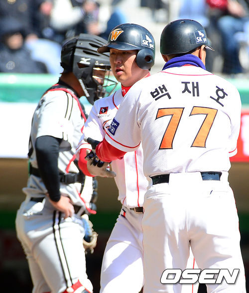 21일 오후 인천 문학구장에서 '2014 프로야구' 시범경기 SK 와이번스와 LG 트윈스의 경기가 열렸다. 3회말 2사 주자 1루 SK 최정이 좌월 동점 투런 홈런을 날린 후 1루에서 백재호 코치와 하이파이브를 하고 있다.