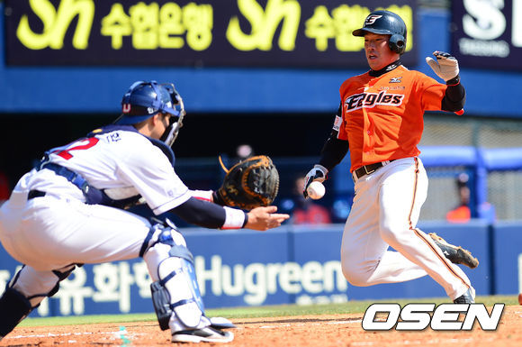 21일 오후 서울 잠실구장에서 열린 '2014 프로야구 시범경기' 두산 베어스와 한화 이글스의 경기 5회초 2사 1,3루 정근우의 좌전 2루타에 1루주자 김민수가 홈까지 쇄도하고 있다. 김민수는 홈에서 태그 아웃.
