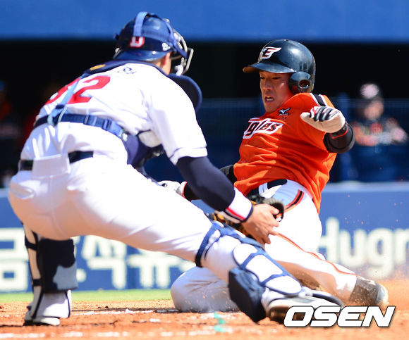 21일 오후 서울 잠실구장에서 열린 '2014 프로야구 시범경기' 두산 베어스와 한화 이글스의 경기 5회초 2사 1,3루 정근우의 좌전 2루타에 1루주자 김민수가 홈까지 쇄도하고 있다. 김민수는 홈에서 태그 아웃.