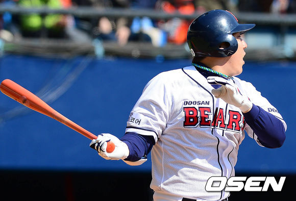 21일 오후 서울 잠실구장에서 열린 '2014 프로야구 시범경기' 두산 베어스와 한화 이글스의 경기 5회말 2사 2루 김현수가 좌전 안타를 치고 있다. 2루주자 오재원은 홈인.