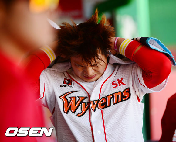 21일 오후 인천 문학구장에서 '2014 프로야구' 시범경기 SK 와이번스와 LG 트윈스의 경기가 열렸다. 5회를 마친 SK 정상호가 땀을 닦고 있다.