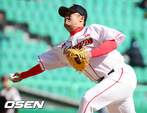21일 오후 인천 문학구장에서 '2014 프로야구' 시범경기 SK 와이번스와 LG 트윈스의 경기가 열렸다. 6회말 2사 주자 1,2루 교체 투입된 SK 임경완이 힘차게 공을 뿌리고 있다.