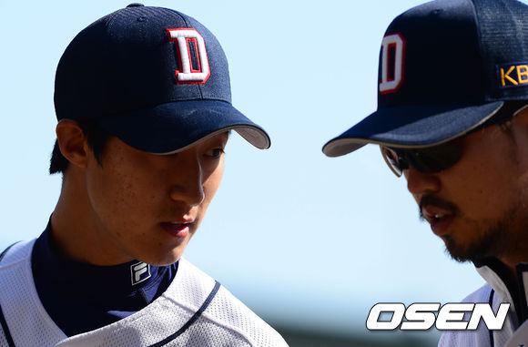 21일 오후 서울 잠실구장에서 열린 '2014 프로야구 시범경기' 두산 베어스와 한화 이글스의 경기 6회초를 마친 허준혁이 덕아웃으로 향하며 오재원과 이야기를 나누고 있다.