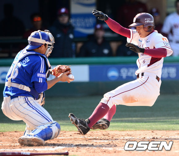 7회말 1사 ,3에서 넥센 백승룡이 문우람의 좌익수 플라이에 태그업, 홈에서 삼성 이지영의 태그에 앞서 세이프되고 있다.