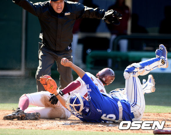 7회말 1사 ,3에서 넥센 백승룡이 문우람의 좌익수 플라이에 태그업, 홈에서 삼성 이지영의 태그에 앞서 세이프되고 있다.