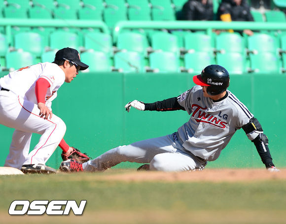 21일 오후 인천 문학구장에서 '2014 프로야구' 시범경기 SK 와이번스와 LG 트윈스의 경기가 열렸다. 8회초 선두타자 LG 문선재가 좌중간 3루타를 날린 후 3루에 몸을 날려 세이프 되고 있다.