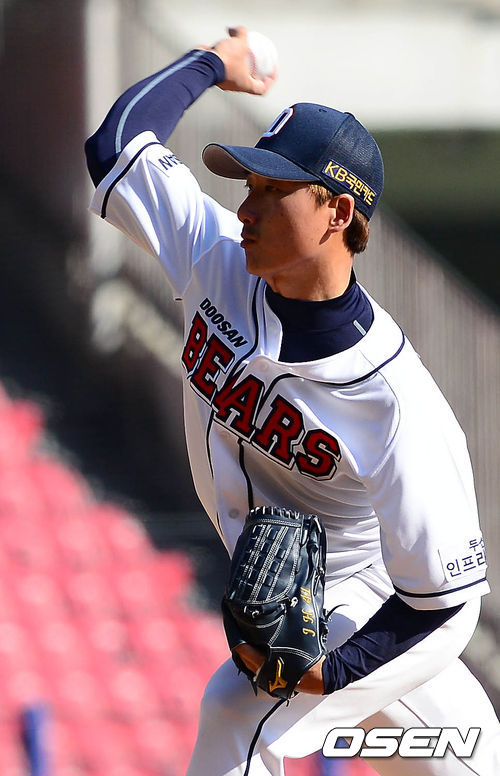 21일 오후 서울 잠실구장에서 열린 '2014 프로야구 시범경기' 두산 베어스와 한화 이글스의 경기 9회초 정재훈이 역투하고 있다.