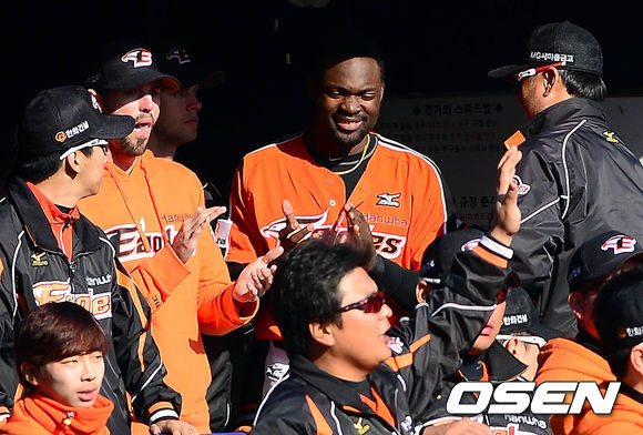 21일 오후 서울 잠실구장에서 열린 '2014 프로야구 시범경기' 두산 베어스와 한화 이글스의 경기 종료 후 피에가 동료들과 하이파이브를 나누고 있다.