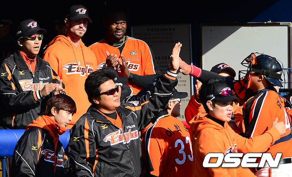 21일 오후 서울 잠실구장에서 열린 '2014 프로야구 시범경기' 두산 베어스와 한화 이글스의 경기 종료 후 한화 선수들이 덕아웃에서 하이파이브를 하고 있다.