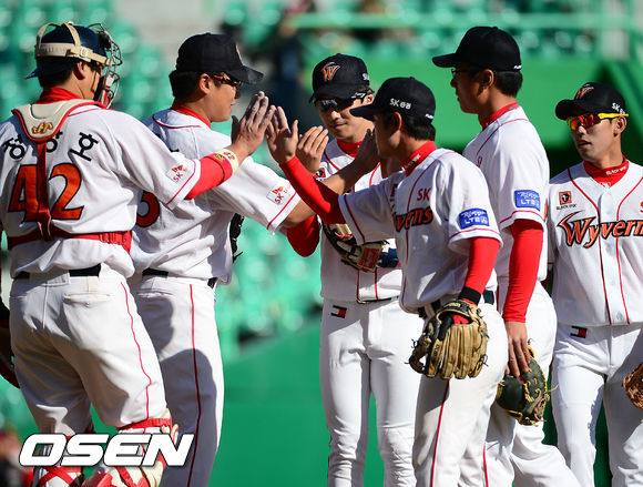 경기를 마치고 SK 선수들이 그라운드 위에서 하이파이브를 하고 있다. / rumi@osen.co.kr