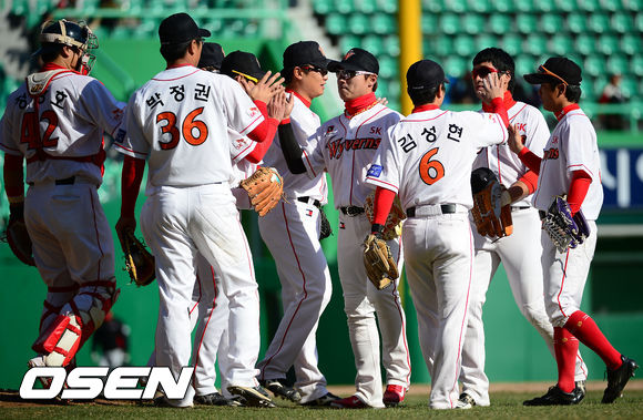 경기를 마치고 SK 선수들이 그라운드 위에서 하이파이브를 하고 있다. / rumi@osen.co.kr
