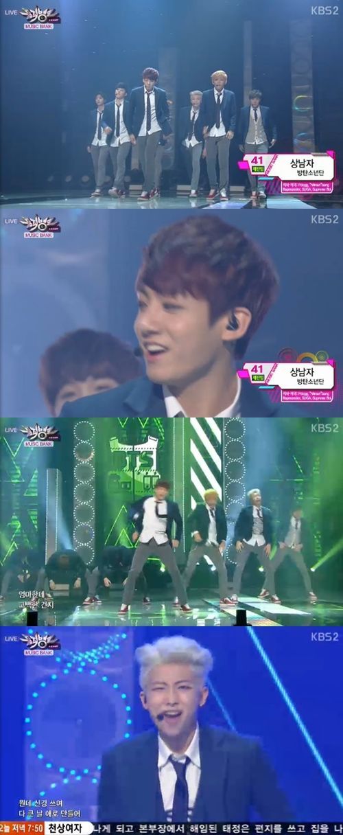 방탄소년단은 21일 방송된 KBS 2TV 음악프로그램 '뮤직뱅크'에서 '상남자'를 열창했다.