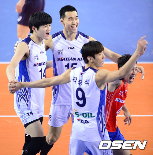 2세트 대한항공 선수들이 득점 후 환호하고 있다.