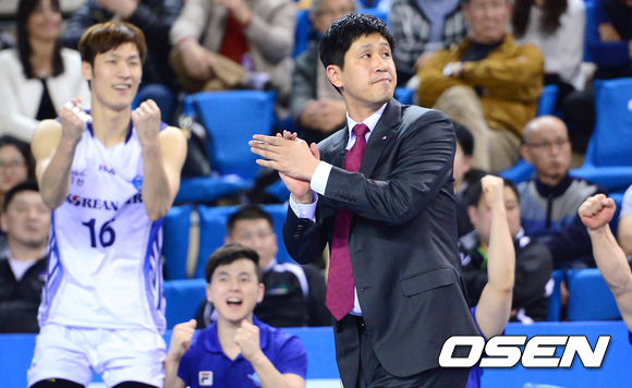 3세트 대한항공 김종민 감독이 선수들에게 박수를 보내고 있다.
