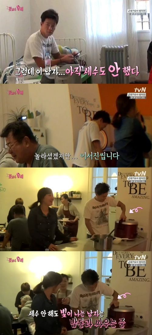 이날 이서진은 일어나자마자 할배들에게 깍듯하게 문안인사를 드린 후, 세수도 하지 않고 바르셀로나 공부 삼매경에 나섰다.